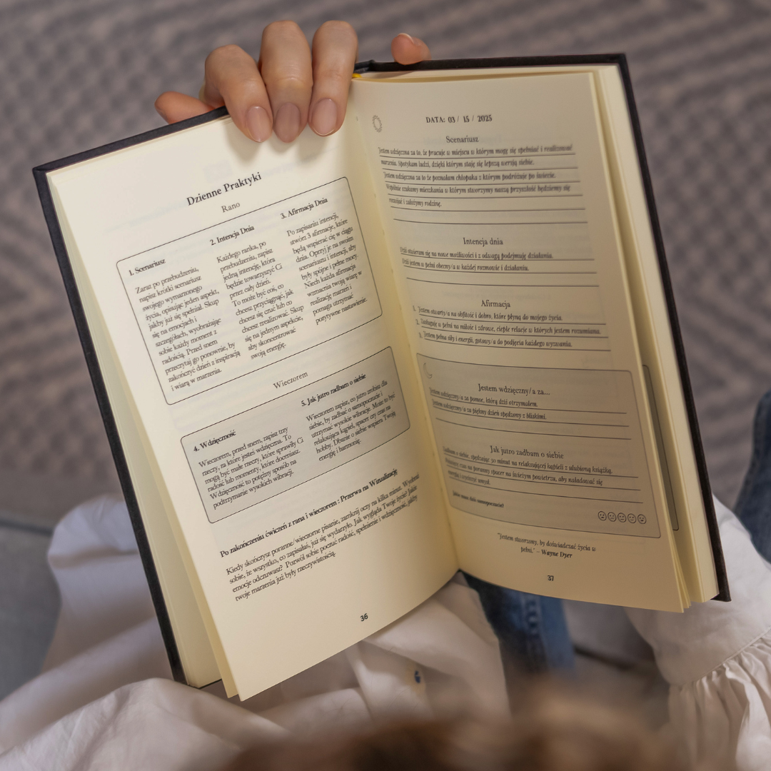 Wyobraź sobie, że każdy dzień zaczynasz z jasnym umysłem, pełnym intencji i wiary w to, że wszystko, czego pragniesz, jest w zasięgu Twoich rąk. Że zamiast chaosu i niepewności, masz swój własny rytuał, który prowadzi Cię prosto do życia, o jakim marzysz. Ten dziennik to nie tylko miejsce na słowa – to przestrzeń, w której Twoje myśli stają się rzeczywistością. To codzienna chwila dla Ciebie – by się zatrzymać, poczuć wdzięczność, zapisać pragnienia i nadać kierunek swoim działaniom.