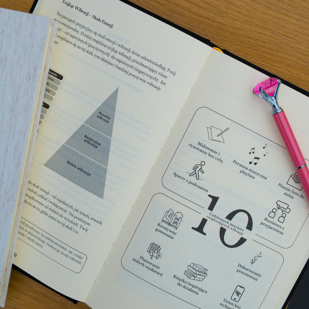 Dziennik będzie dla Ciebie narzędziem do systematycznej praktyki. Pomaga uporządkować myśli, utrzymać wysokie wibracje i codziennie wracać do swoich intencji.